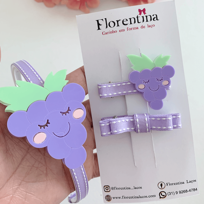 Arquinho e Hair Clips Infantil temático de frutinhas, com tema de uva.