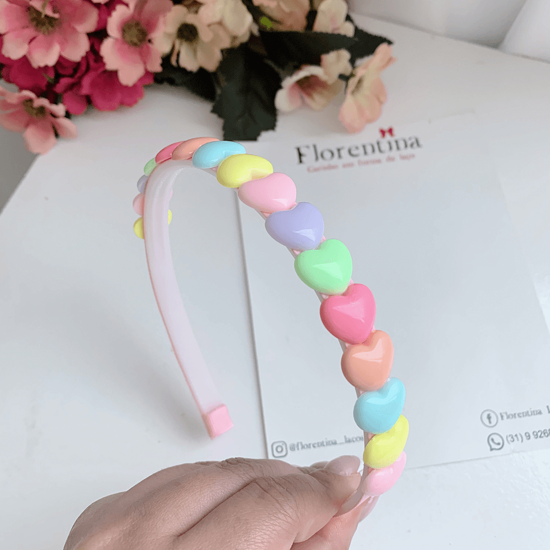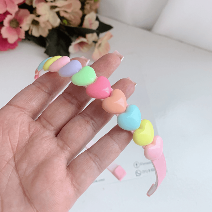 Tiara infantil com vários corações de cores alegres.