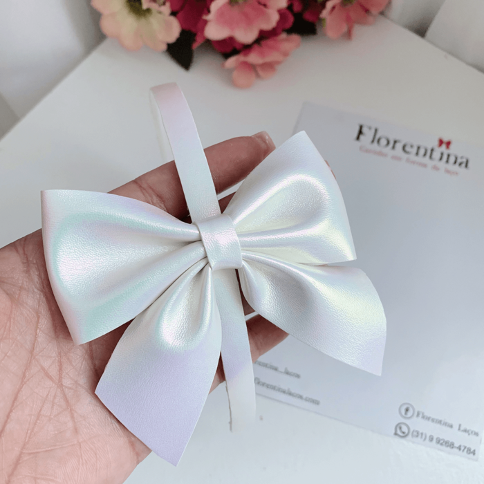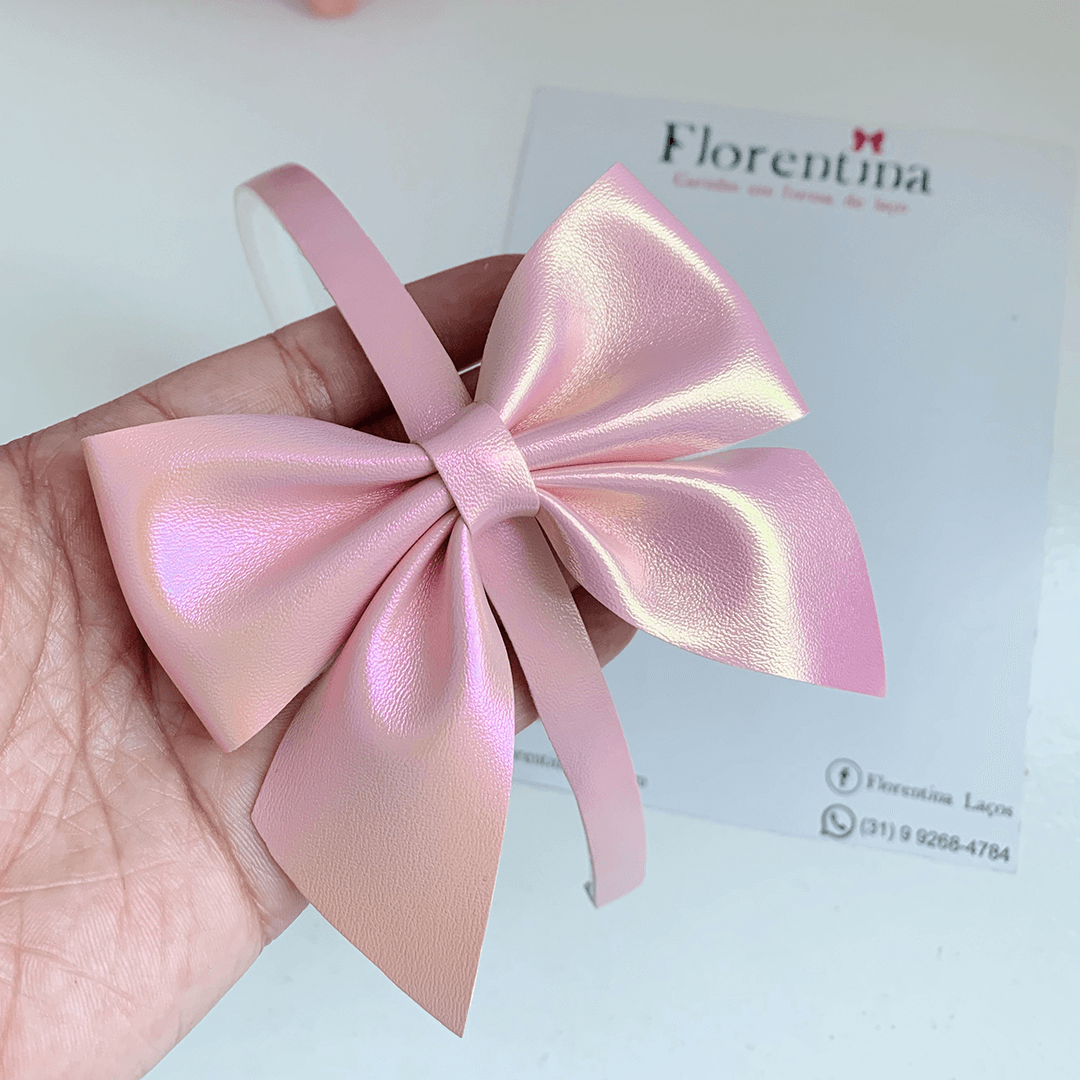 Arquinho com laço metalizado, disponível nas cores rosa e branco.